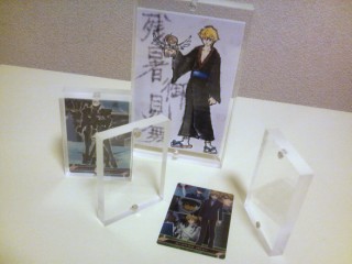 せきしき様から頂いた残暑見舞いの隊長&技術顧問(妖精)とかウェファーカードのグラハム&カスフラとかを飾るに相応しい、シンプルで小粋なアクリルブロックのフォトスタンド…マグネット式なのが無意味に嬉しい。