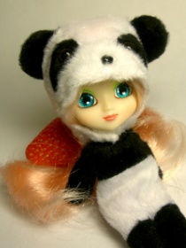 パンダのきぐるみ、色白な肌、くるんとカールした淡いピンクの髪、明るい青緑色の大きな目!!!