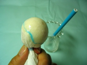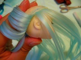 接着剤が透明なので、ドールヘッドの額や耳は見えている。