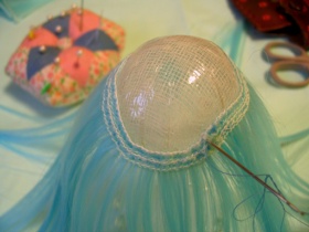そこで頭皮をひっくり返して裏側にウェフティングを仮縫いした。