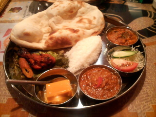 注文したのはマハラジャコース…カレー二種選択、ナンとライスと小さいタンドリーチキンとシクカバブとミニサラダとマンゴープリンが付いてきて、なおかつドリンクはラッシーかチャイか選べるお得セット。