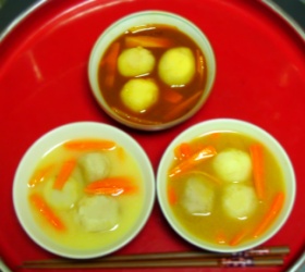 具はサトイモとニンジン。ほんだし入れて煮ておいて、三分の一ずつ別鍋に移し、味噌を投入して三つ作る。
