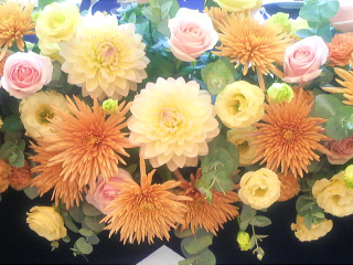 秋らしく菊を取り入れ、ただし変わり咲きのものであり色もパステル系で地味さは皆無。