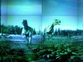 草食恐竜が高い木の葉を食べていると、漫才のコンビのようなどつき合いをしながら肉食恐竜が登場。
