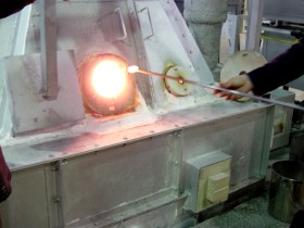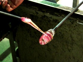写真はガラス炉からポンテ(金属の棒)に溶けたガラスを取ってきたところ。