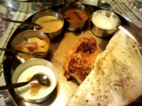 1700円ほどで、タンドリーチキンとナン、あと米飯も少し。それにヨーグルトとフルーツが付いて、カレーを二種類選べるという内容。